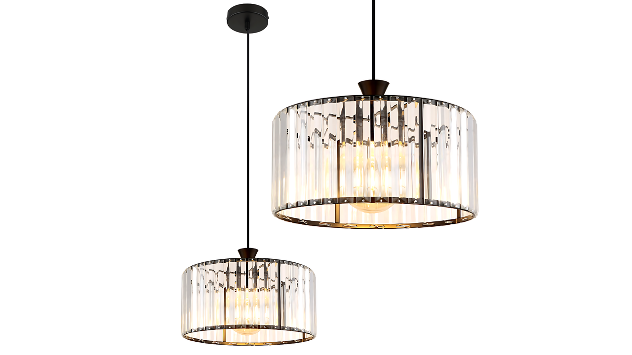 Moderní závěsná lampa o průměru 30 cm je ideálním řešením pro milovníky loftového a moderního stylu. Její černá konstrukce, kabel a kryt tvoří ucelený celek, zatímco transparentní stínidlo složené z vertikálních plastových prvků dodává interiéru lehkost a eleganci.