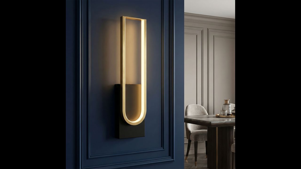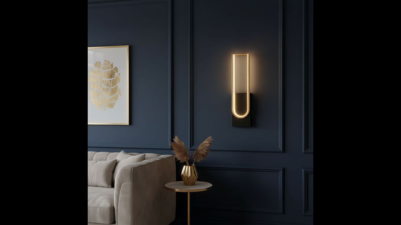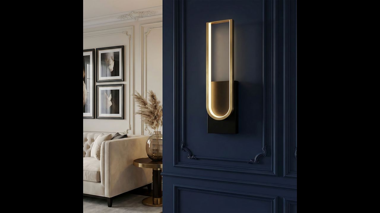 Tento elegantní LED nástěnný svítilna spojuje moderní minimalismus s luxusním provedením. Model vyniká černou základnou a dekorativním rámem v odstínu kartáčovaného zlata. Uvnitř konstrukce je veden LED pásek, který vyzařuje rovnoměrné, měkké světlo ideální pro vytvoření atmosférické nálady.