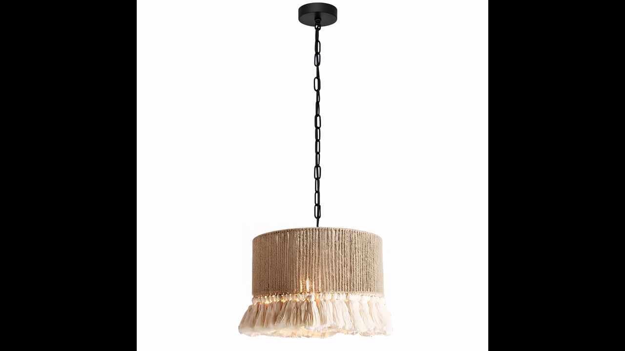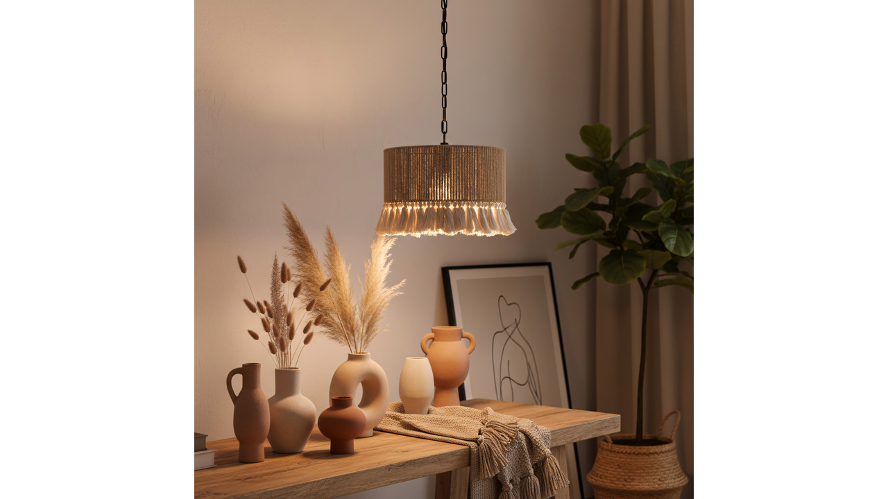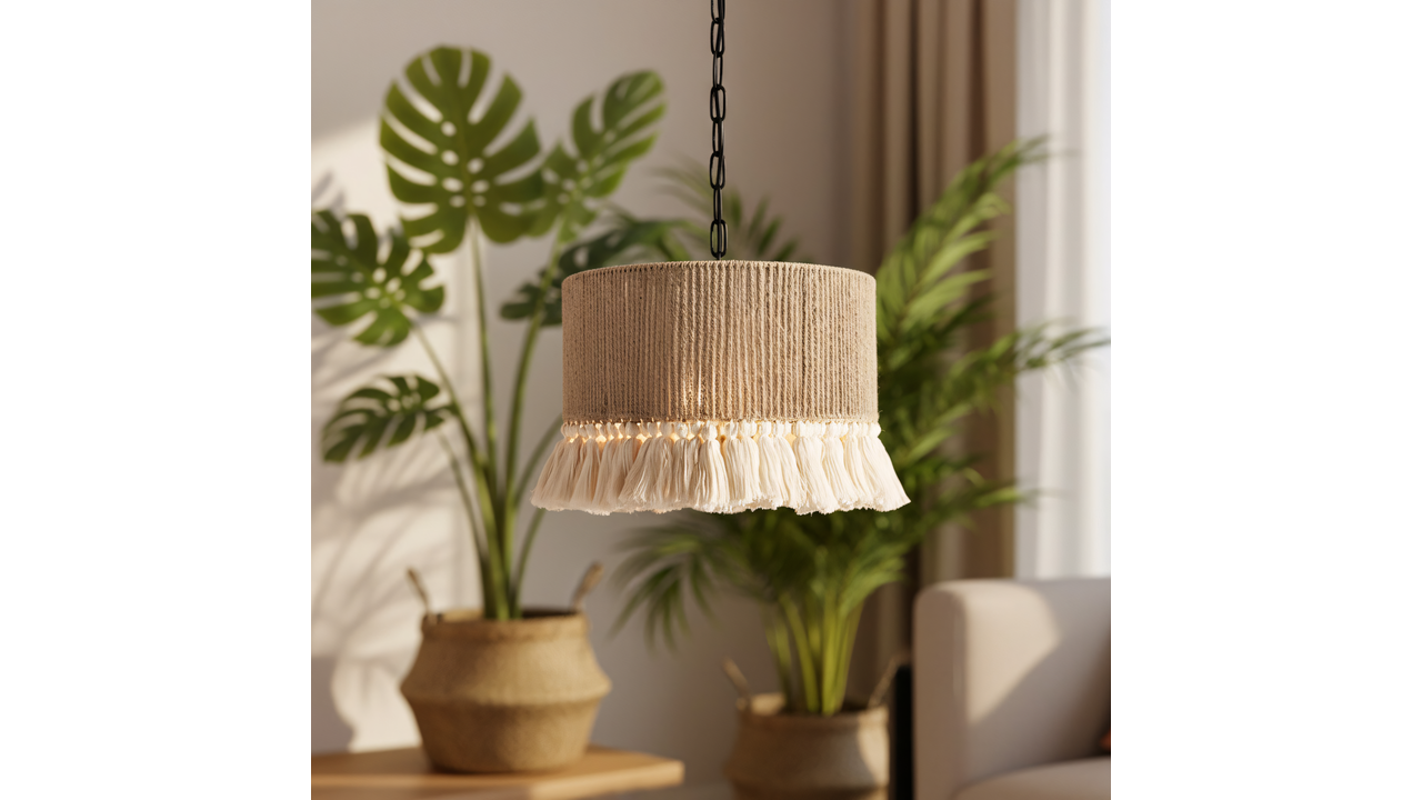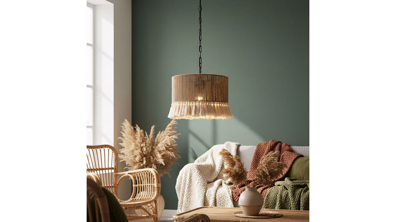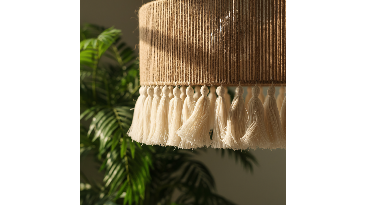 Závěsná lampa v boho stylu okouzlí kombinací přírodních materiálů a měkké, dekorativní formy. Stínidlo ze jutového provazu vytváří teplou, útulnou atmosféru a dekorativní třásně dodávají lehkost a charakteristický etnický vzhled. Celá konstrukce je postavena na pevném kovovém rámu, který zajišťuje stabilitu a perfektní provedení detailů.