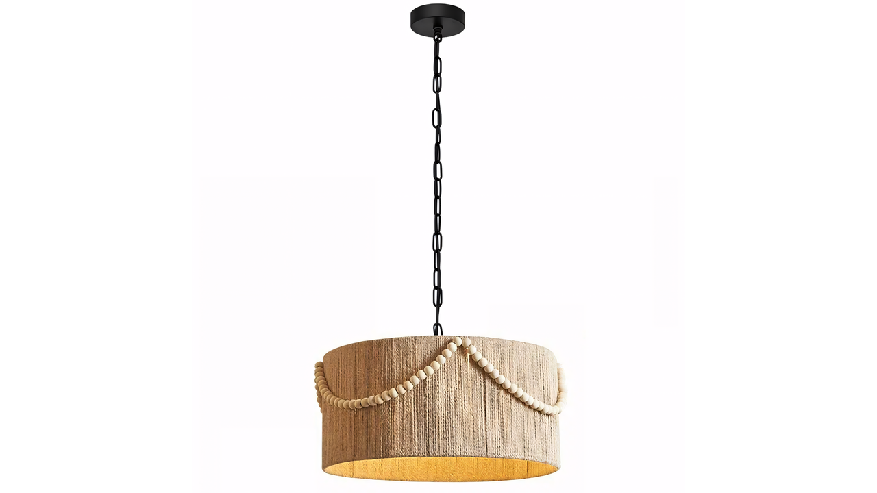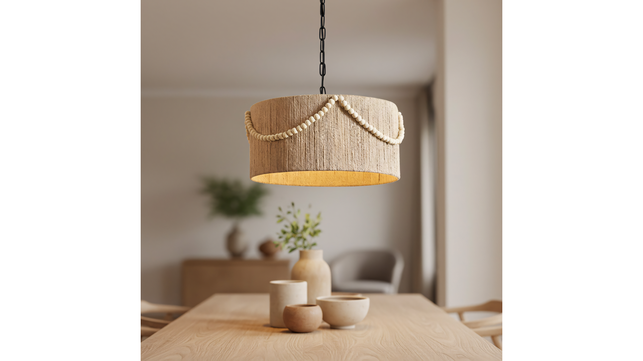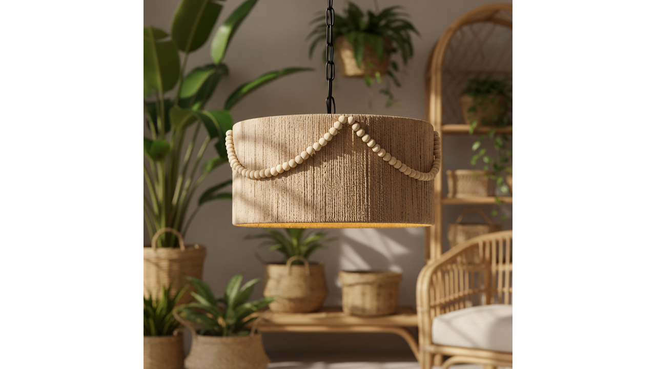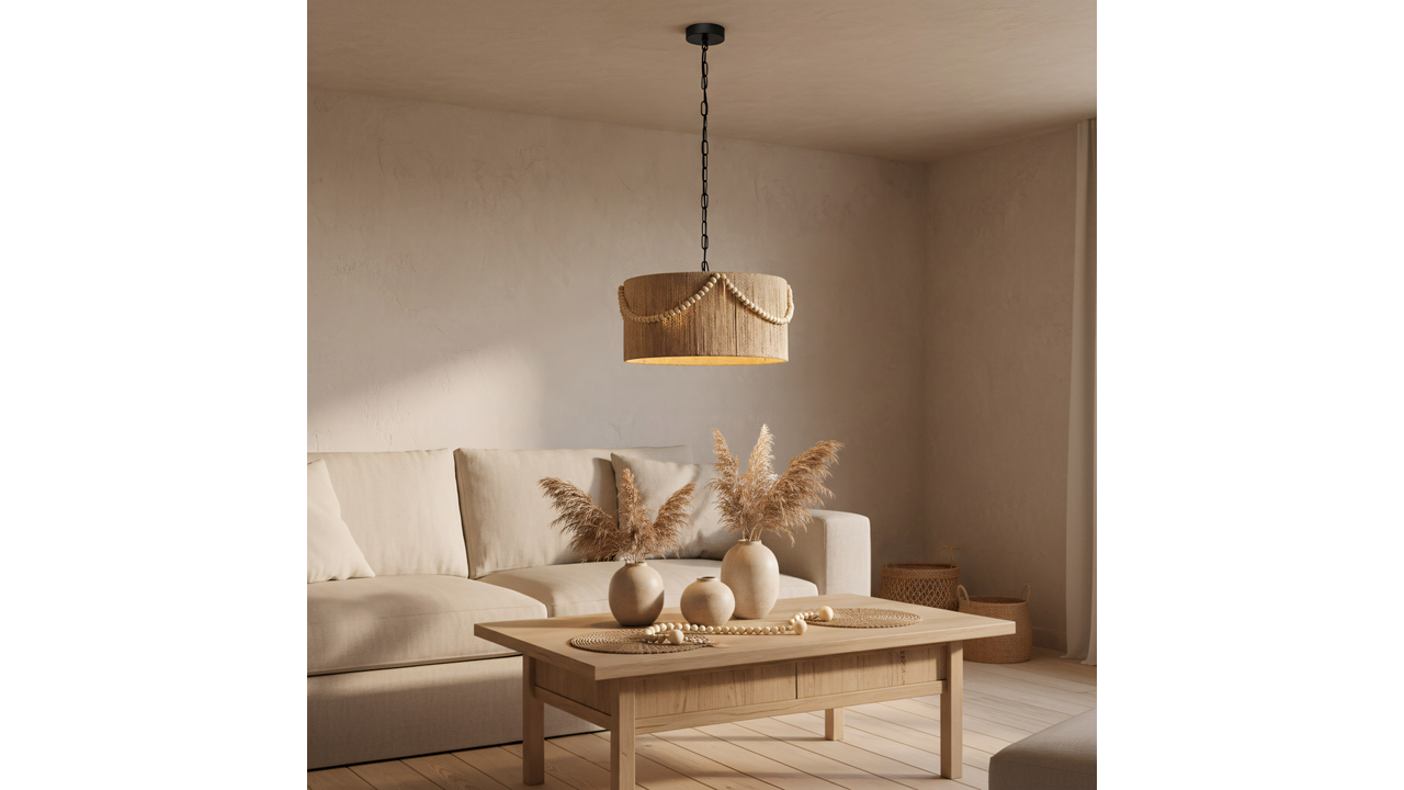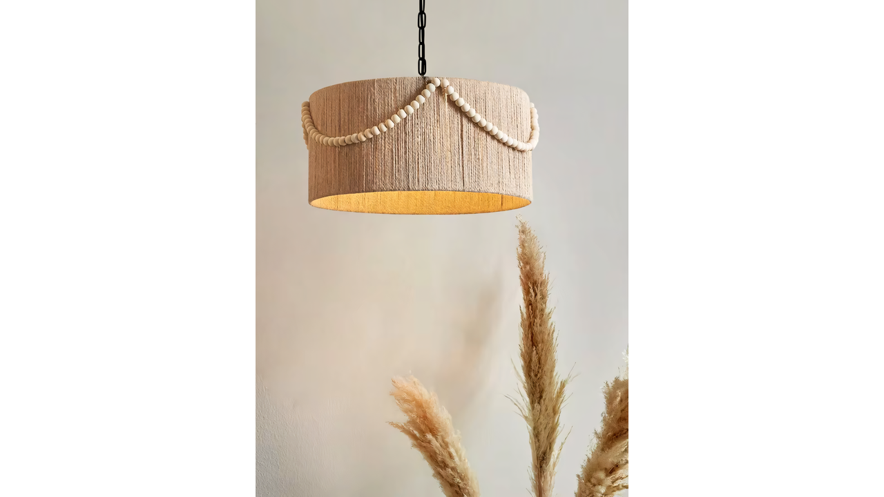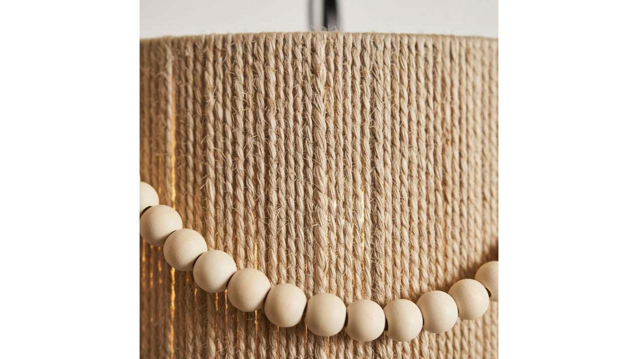 Boho lampa ze jutového provazu je řešení, které vnese do interiéru teplo, lehkost a přírodní estetiku. Stínidlo z jutového provazu vytváří v místnosti hřejivou, intimní atmosféru a dřevěné korálky, které jej obepínají, dodávají celému návrhu jemný, ručně vyráběný charakter. Celek je usazen na pevné kovové konstrukci, která lampu stabilně nese a harmonicky ladí s organickým stylem stínidla.