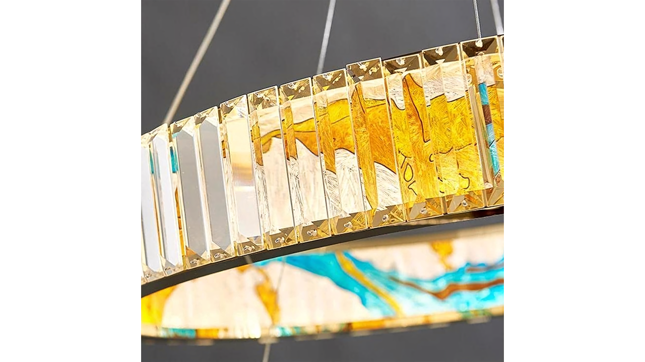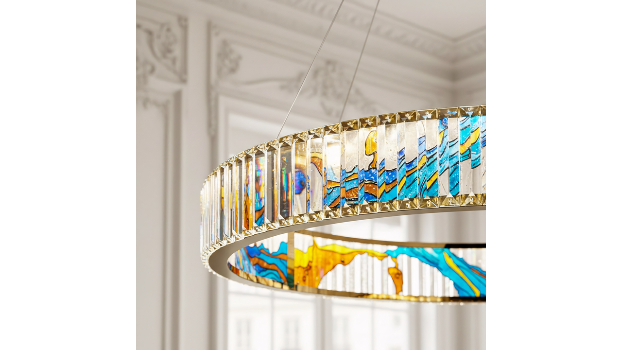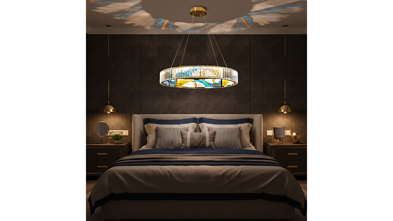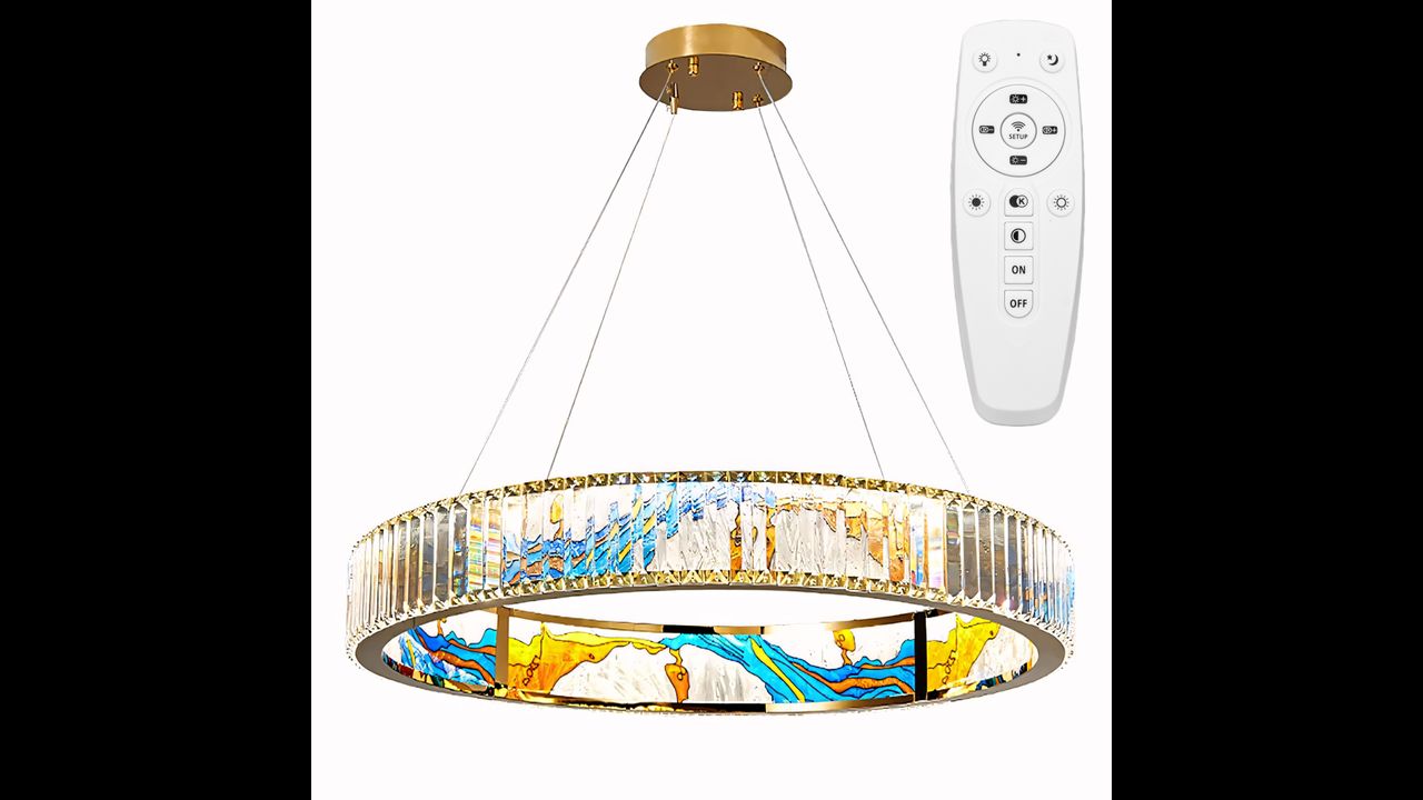 Toto elegantní LED závěsné svítidlo je výjimečným spojením moderní formy, uměleckých detailů a luxusního provedení. Konstrukce je vyrobena ze zlato zbarveného kovu, který krásně kontrastuje s transparentními akrylovými prvky imitujícími křišťál. Celé svítidlo tvoří působivý prstenec zavěšený na tenkých minimalistických lankách, což vytváří pocit lehkosti a vznášení v prostoru. Jedním z nejvýraznějších prvků modelu je dekorativní část připomínající vitráž. Model je vybaven pokročilým LED modulem s regulací teploty 3000K–6000K a dálkovým ovladačem, který poskytuje plnou kontrolu nad osvětlením. Ovladač umožňuje zapínání a vypínání lampy, přepínání režimů den/noc, plynulé stmívání a zesvětlování, změnu teplého a studeného světla a rychlé přepínání mezi 2700/4000/6500 K. Díky tomu lze světlo přesně přizpůsobit — večer teplé a atmosférické, přes den jasné a energické. Křišťálové LED závěsné svítidlo skvěle odráží styly glamour, art déco a modern classic a dodává interiéru mimořádný lesk a luxusní charakter. Transparentní prvky jemně rozptylují světlo a vytvářejí elegantní vícevrstvý efekt.