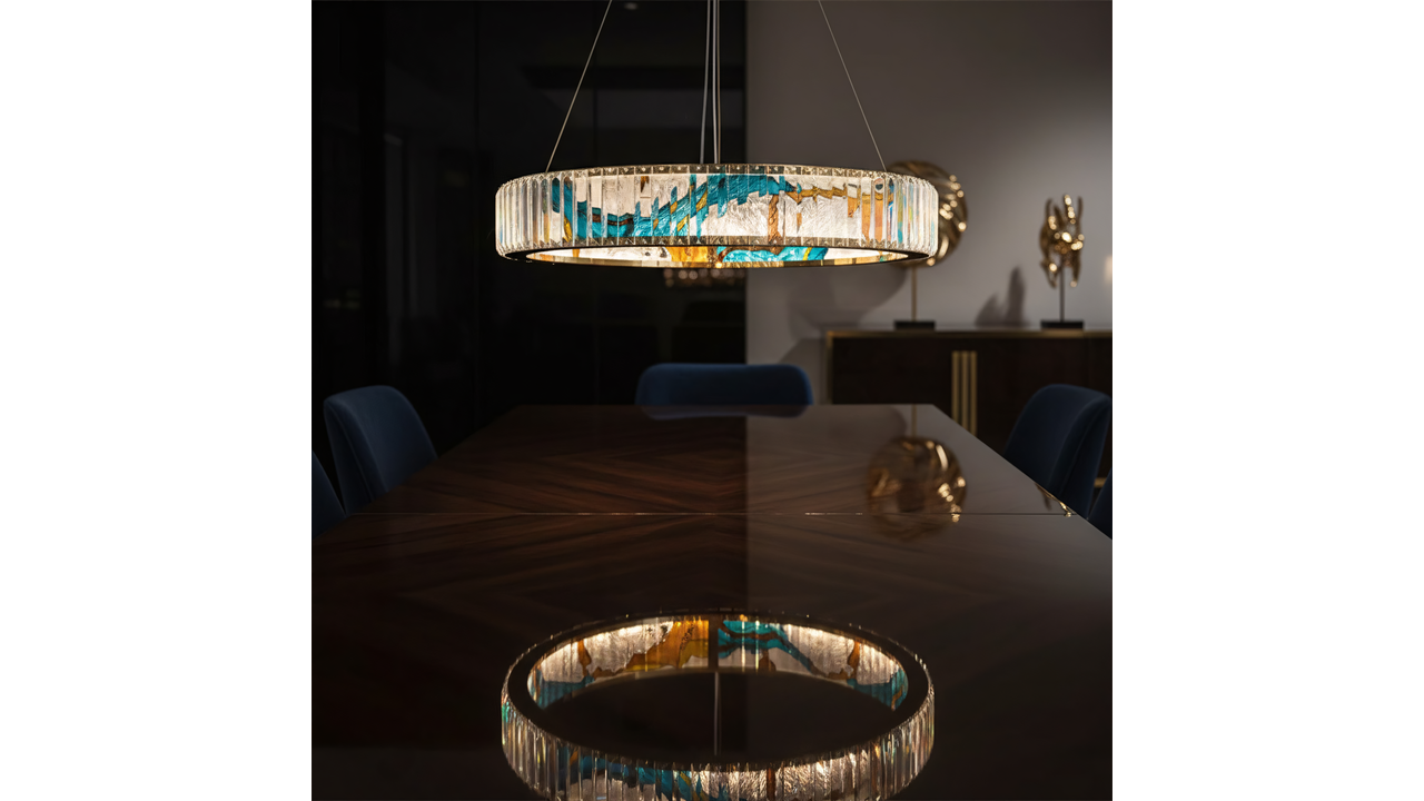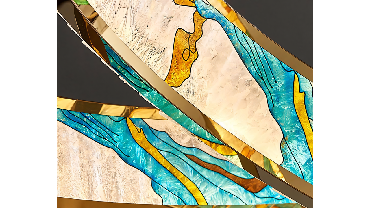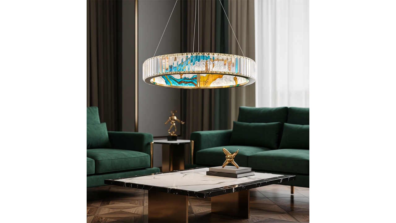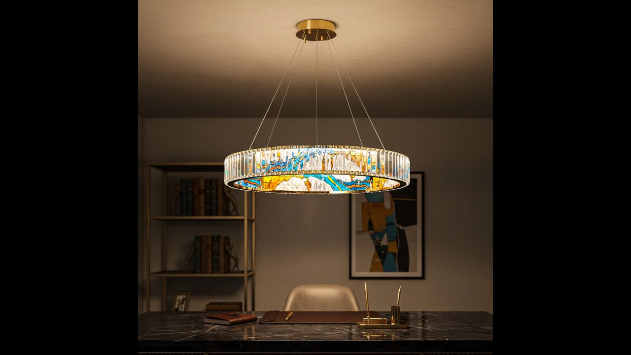 Toto elegantní LED závěsné svítidlo je výjimečným spojením moderní formy, uměleckých detailů a luxusního provedení. Konstrukce je vyrobena ze zlato zbarveného kovu, který krásně kontrastuje s transparentními akrylovými prvky imitujícími křišťál. Celé svítidlo tvoří působivý prstenec zavěšený na tenkých minimalistických lankách, což vytváří pocit lehkosti a vznášení v prostoru. Jedním z nejvýraznějších prvků modelu je dekorativní část připomínající vitráž. Model je vybaven pokročilým LED modulem s regulací teploty 3000K–6000K a dálkovým ovladačem, který poskytuje plnou kontrolu nad osvětlením. Ovladač umožňuje zapínání a vypínání lampy, přepínání režimů den/noc, plynulé stmívání a zesvětlování, změnu teplého a studeného světla a rychlé přepínání mezi 2700/4000/6500 K. Díky tomu lze světlo přesně přizpůsobit — večer teplé a atmosférické, přes den jasné a energické. Křišťálové LED závěsné svítidlo skvěle odráží styly glamour, art déco a modern classic a dodává interiéru mimořádný lesk a luxusní charakter. Transparentní prvky jemně rozptylují světlo a vytvářejí elegantní vícevrstvý efekt.