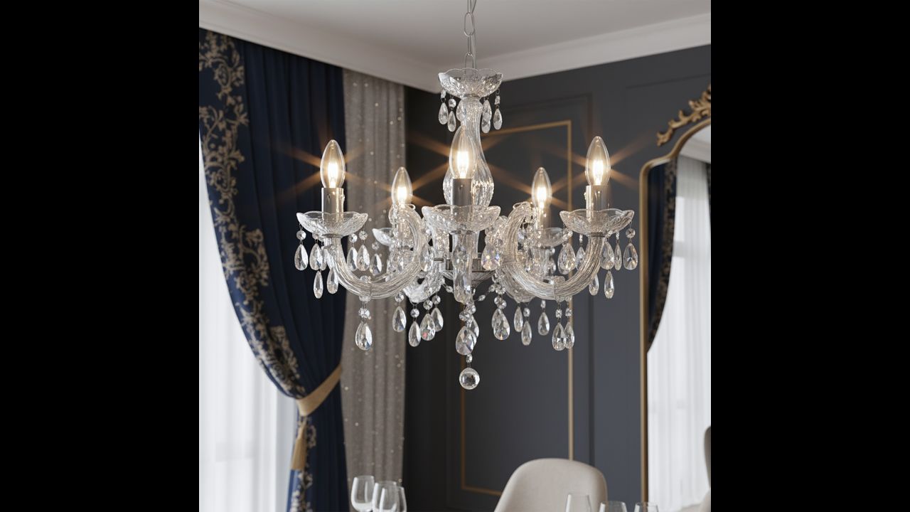 Pěti ramený chromový lustr s čirými přívěsky dodá jídelně i obýváku reprezentativní ráz. Vyvážená silueta rozptyluje světlo rovnoměrně a nastavitelná výška usnadní umístění nad stůl.