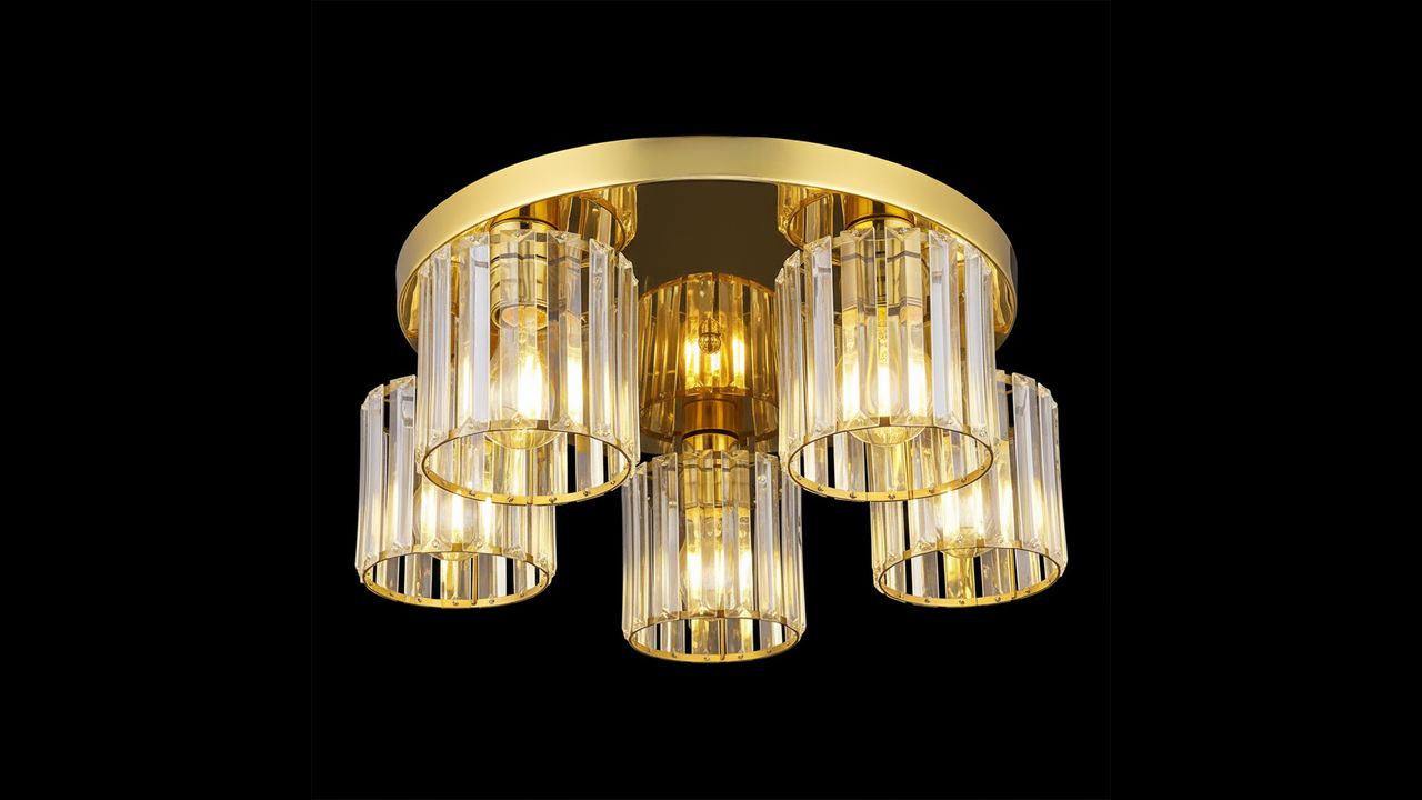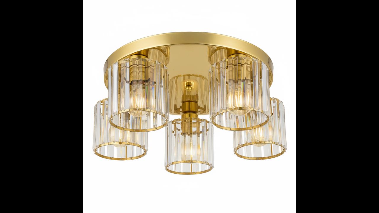 Elegantní zlaté stropní svítidlo s pěti světelnými body spojuje moderní design a nadčasový styl. Jemný lesk vnáší do interiéru teplo a eleganci, zatímco transparentní stínidla s dekorativními krystaly krásně rozptylují světlo a vytvářejí příjemnou atmosféru. Zlaté provedení dodává svítidlu vytříbený charakter, díky čemuž se hodí do obývacího pokoje, ložnice i jídelny. Ideální volba pro interiéry ve stylu glamour, moderním či klasickém – nejen zdroj světla, ale i efektní ozdoba podtrhující eleganci prostoru.