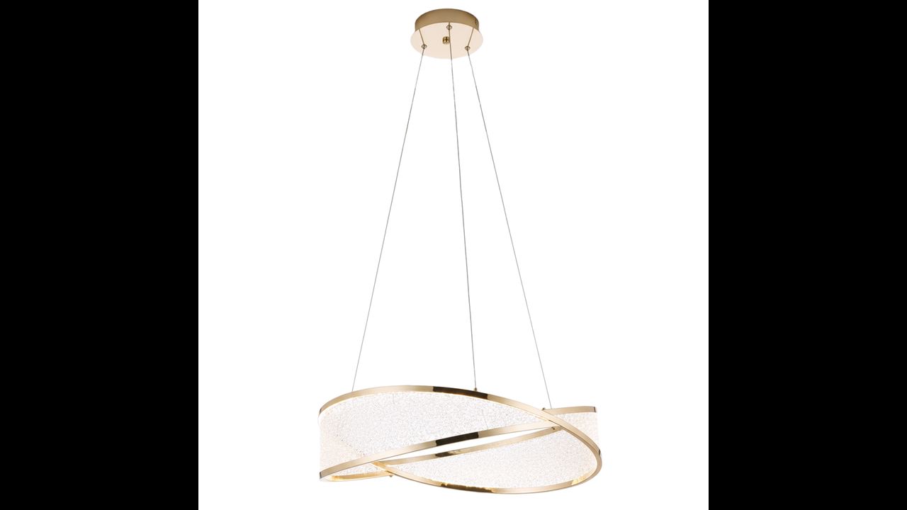 Moderní závěsná LED lampa ve zlatém provedení okouzlí elegantní, plynulou formou a působivou hrou světla. Její konstrukce je založena na dvou prolínajících se prstencích, které vytvářejí dynamický, a přitom mimořádně harmonický tvar. Transparentní, jemně strukturovaný povrch stínidla krásně rozptyluje světlo, dodává mu měkkost a jemný lesk, zatímco zlaté provedení celku propůjčuje luxusní charakter.