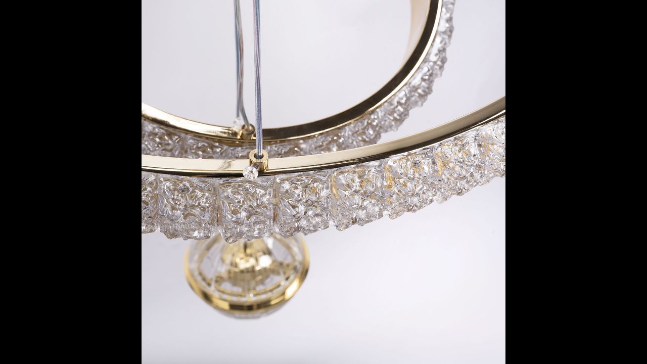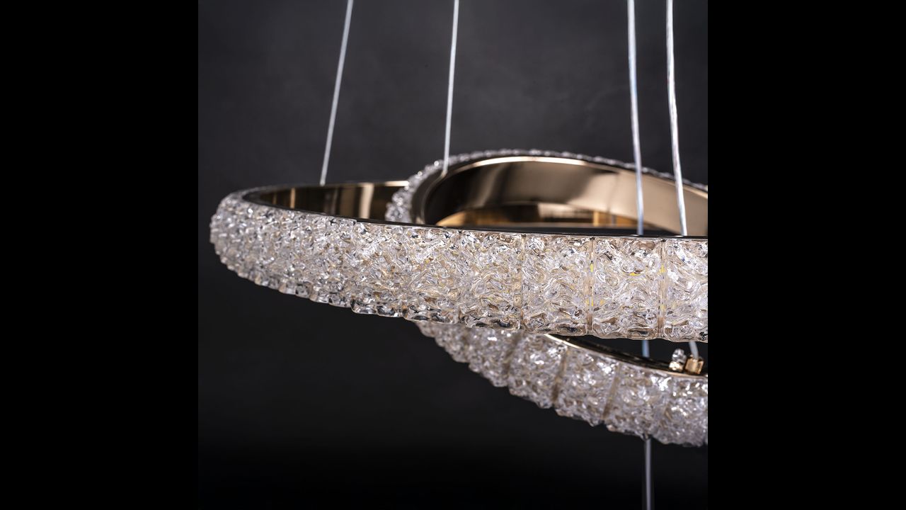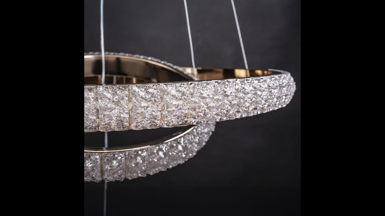 Tato působivá LED lampa spojuje dekorativní charakter s moderním stylem a vytváří výjimečný světelný akcent v obývacím pokoji, jídelně nebo elegantní hale. Světlo září na několika místech — kolem krytky, v centrální kouli a uvnitř kruhů — díky čemuž vzniká působivý, vícerozměrný efekt. Transparentní, strukturované plastové prvky krásně rozptylují světlo a dodávají lampě šperkový lesk.
