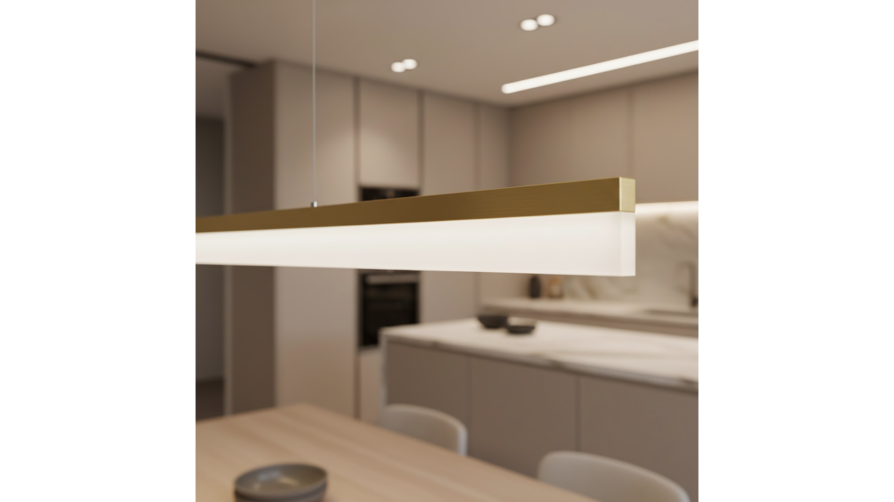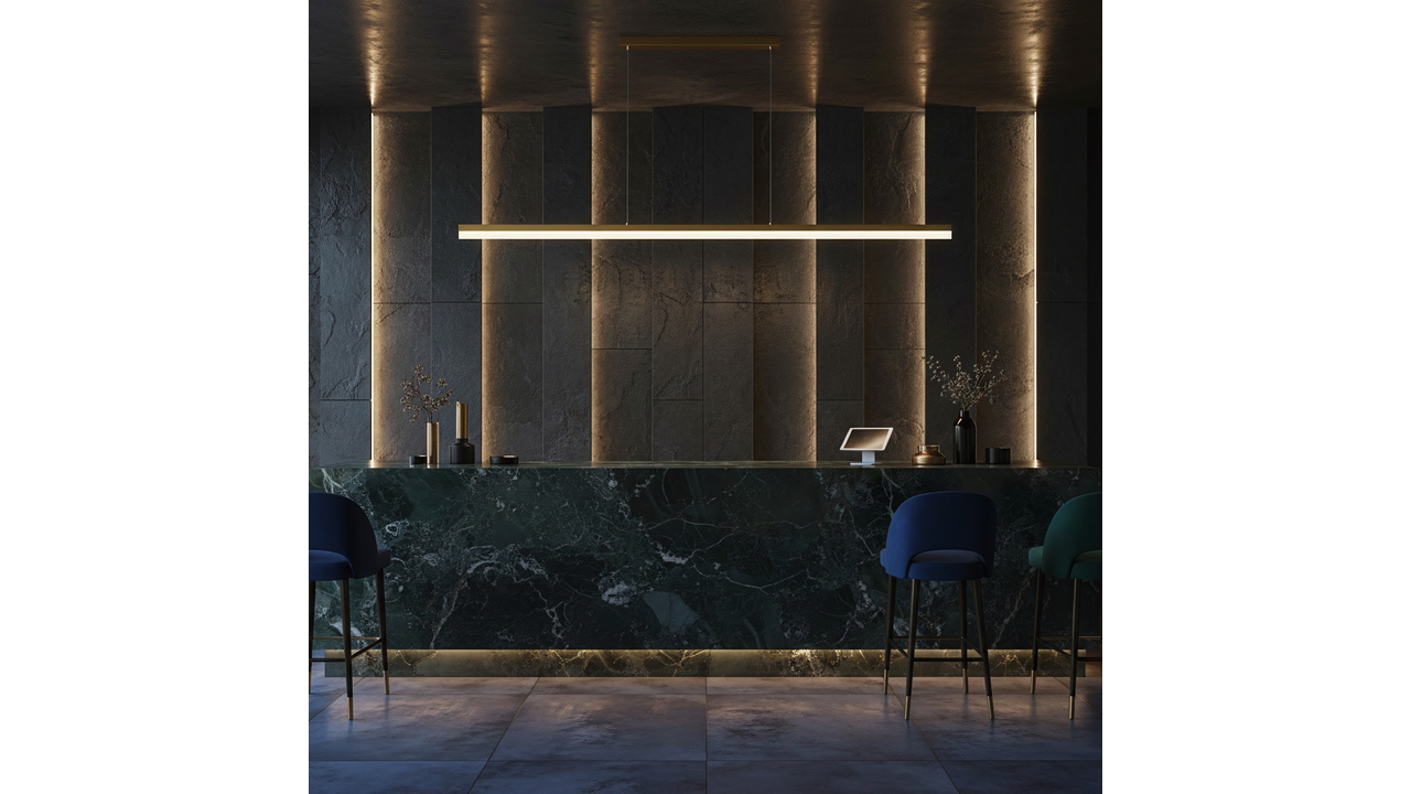 Minimalistické LED závěsné svítidlo zaujme svou štíhlou, prodlouženou formou a nadčasovým stylem, který perfektně doplní moderní, glamour, loft či modern classic interiéry. Kovová konstrukce v broušeném zlatém provedení dodává svítidlu exkluzivní vzhled a dlouhý světelný panel z matného (frosted), poloprůhledného akrylu zajišťuje příjemně rozptýlené, rovnoměrné světlo bez ostrých odlesků.