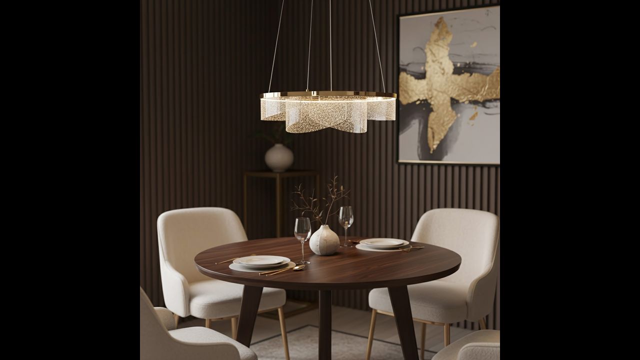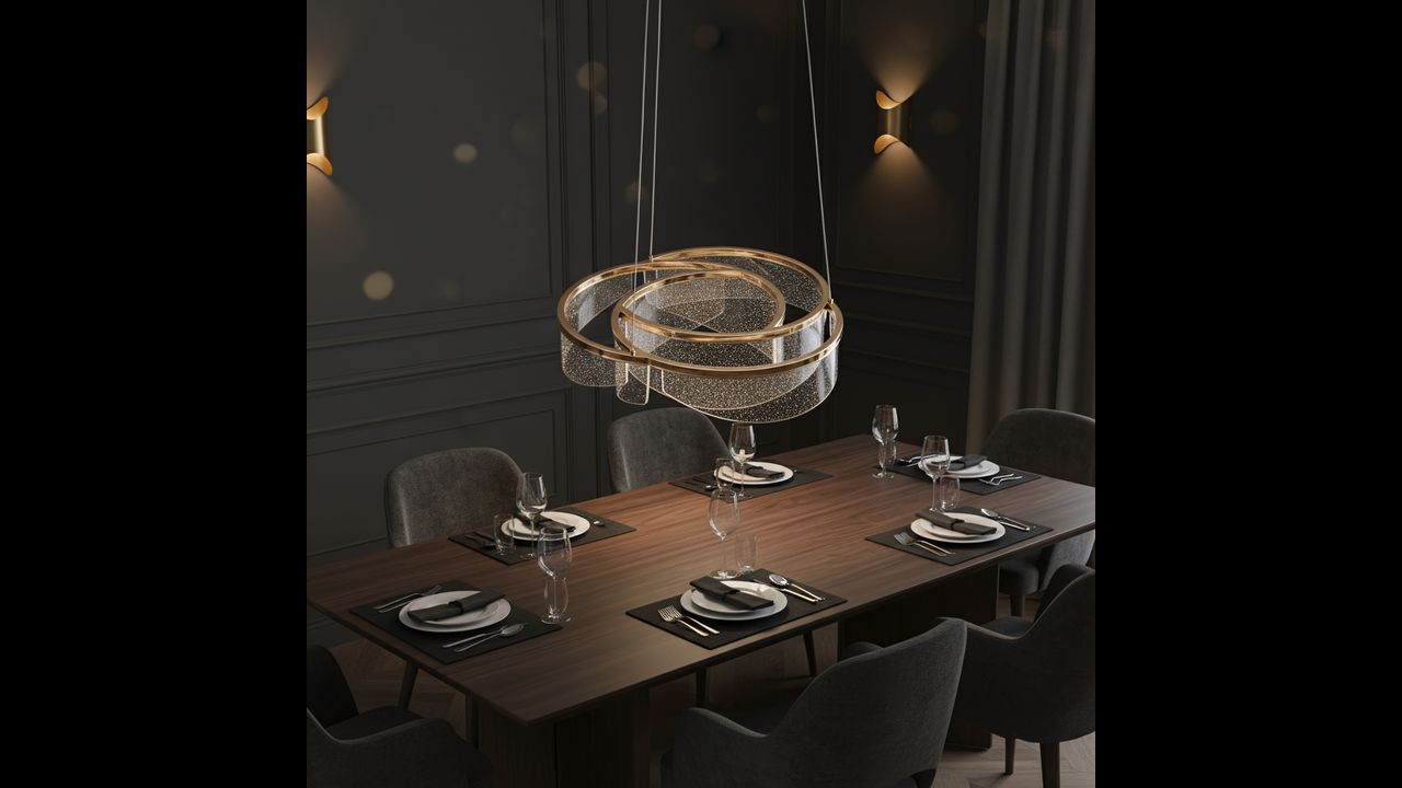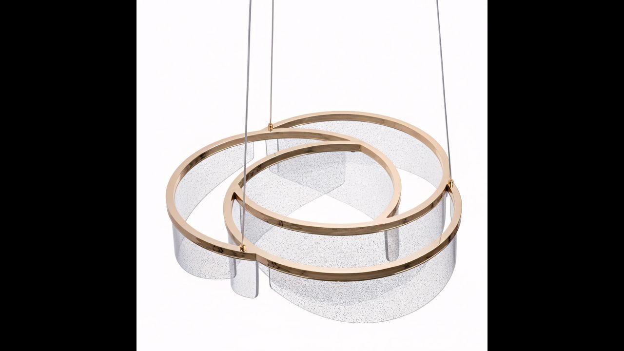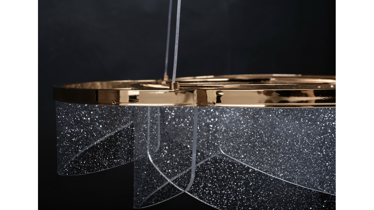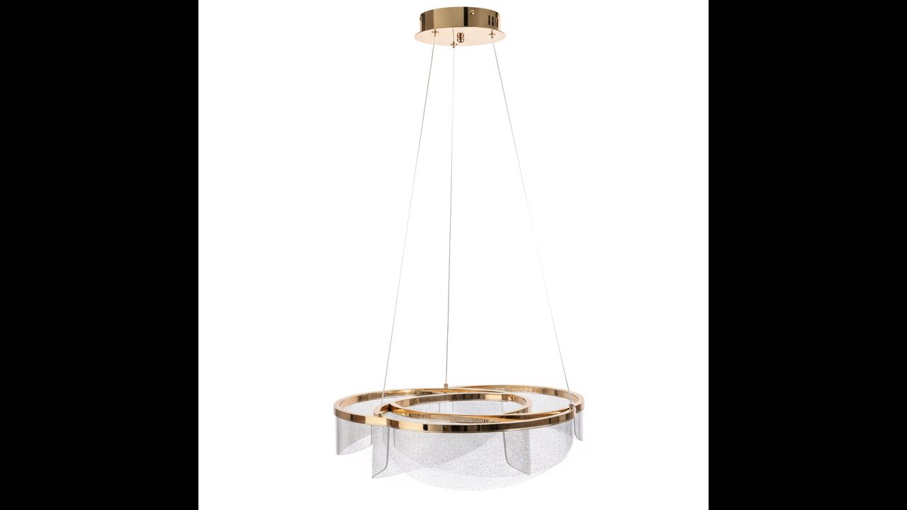 Tato výjimečná stropní LED závěsná lampa spojuje vytříbený design s dekorativním světelným efektem a vytváří v interiéru atmosféru elegance a lehkosti. Zlaté provedení jí dodává ušlechtilý charakter, zatímco transparentní, jemně třpytivý difuzor krásně rozptyluje světlo a zajišťuje efekt decentního, jiskřivého lesku. Integrovaný LED zdroj světla s teplotou 4000K vyzařuje neutrální, pro každodenní použití příjemné světlo, ideální do obývacího pokoje, jídelny, ložnice či moderních reprezentativních prostor. \n\nDynamická forma založená na elegantních, přes sebe uložených kruzích dodává lampě lehký a vzdušný vzhled. Nastavitelná výška zavěšení umožňuje dokonalé přizpůsobení aranžmá – jak nad stolem, kuchyňským ostrůvkem, tak i v centrálním bodě místnosti. Konstrukce z kovu a plastu zaručuje estetický vzhled a transparentní dekorativní panel dodává lampě jedinečný, designový charakter.