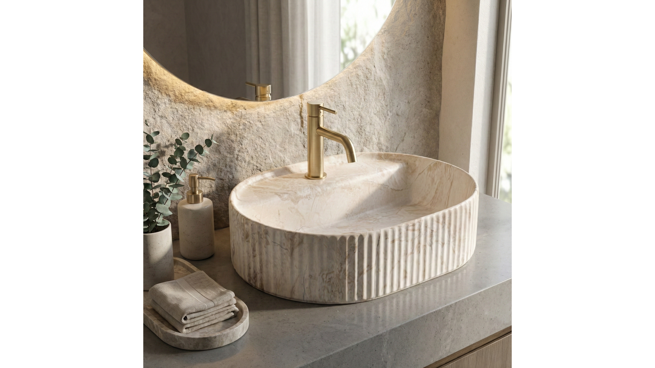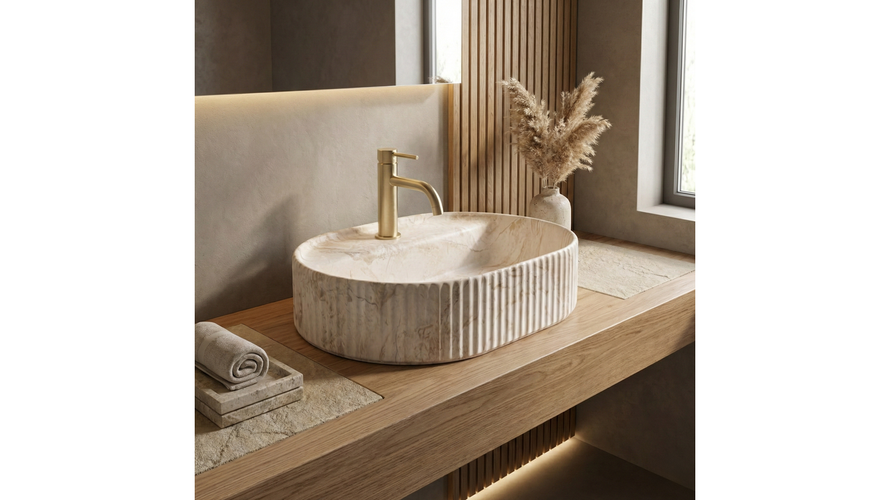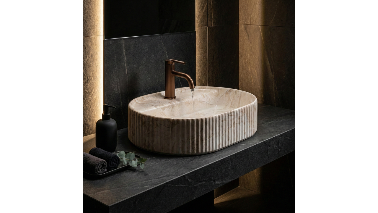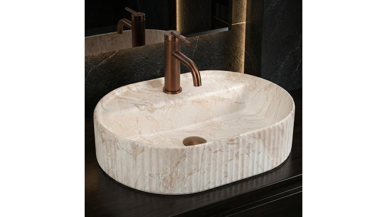 Umyvadlo na desku Rea Marcela 50 ve variantě Saturn je určeno pro ty, kteří oceňují výrazný design spojený s elegantní, tlumenou barevností. Jemně prodloužený oválný tvar působí lehce a moderně, dekorativní svislé rýhování na vnějších stěnách dodává architektonický charakter. Skvělé pro prémiové moderní koupelny, kde hraje roli tvar i detail.