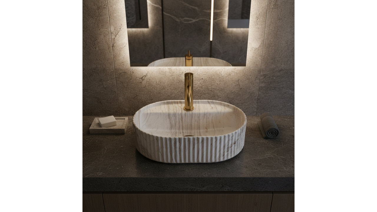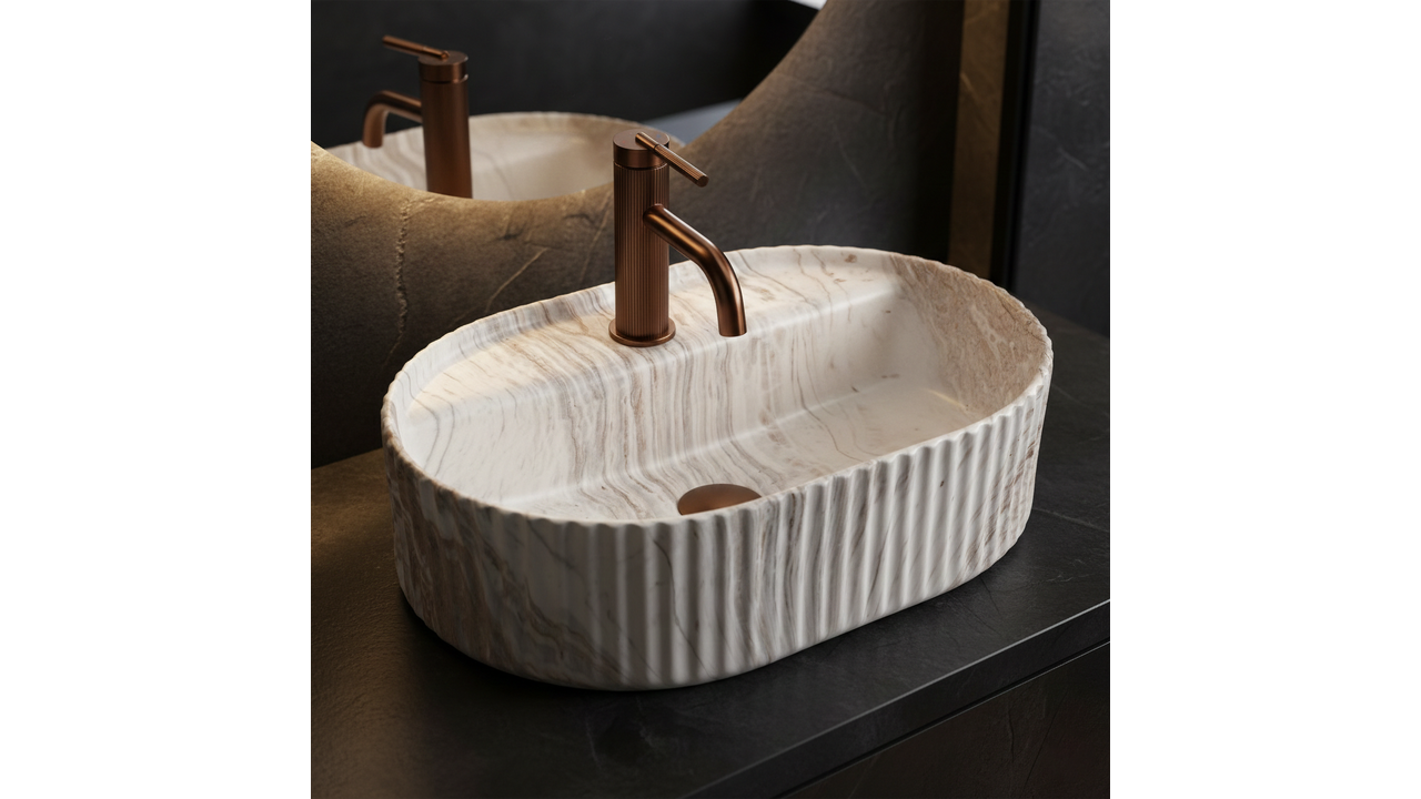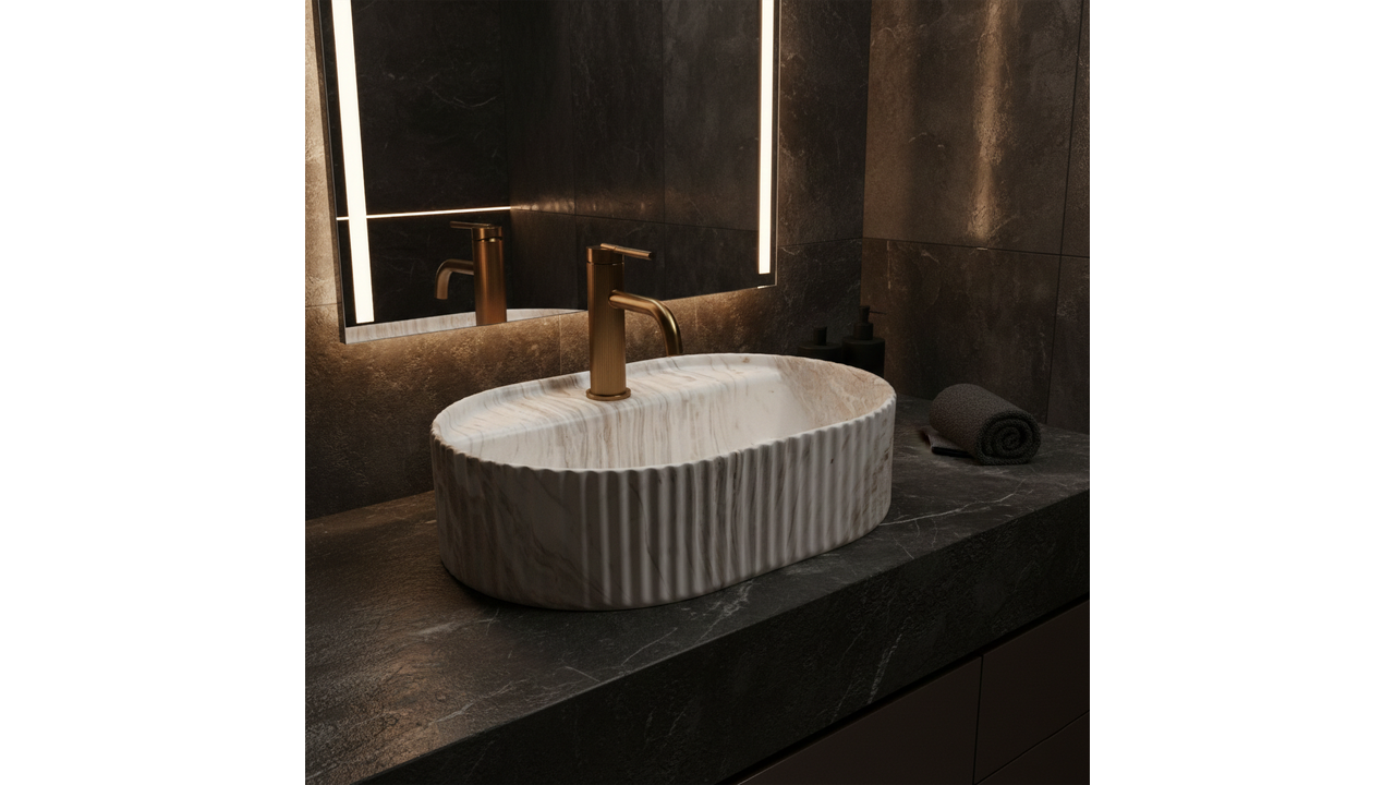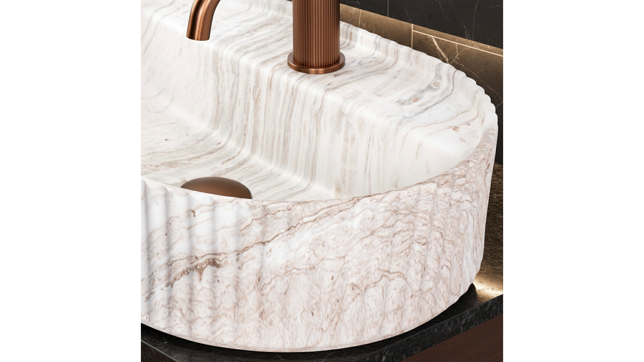 Tvar upoutá pozornost typickým svislým rýhováním na vnější stěně, které podtrhuje designový charakter modelu a dělá z umyvadla propracovaný dekorativní prvek. Uvnitř zůstává mísa hladká a komfortně tvarovaná, což usnadňuje každodenní používání i údržbu. Sanitární keramika nabízí příjemné, ušlechtilé vyhotovení a vzor Kallisto — s přirozenými tonálními přechody a jemným žilkováním — vytváří dojem hloubky a jedinečné kresby, která krásně pracuje se světlem.