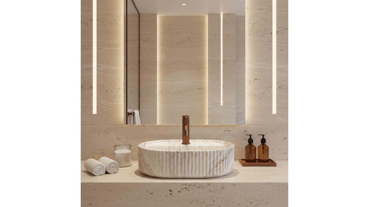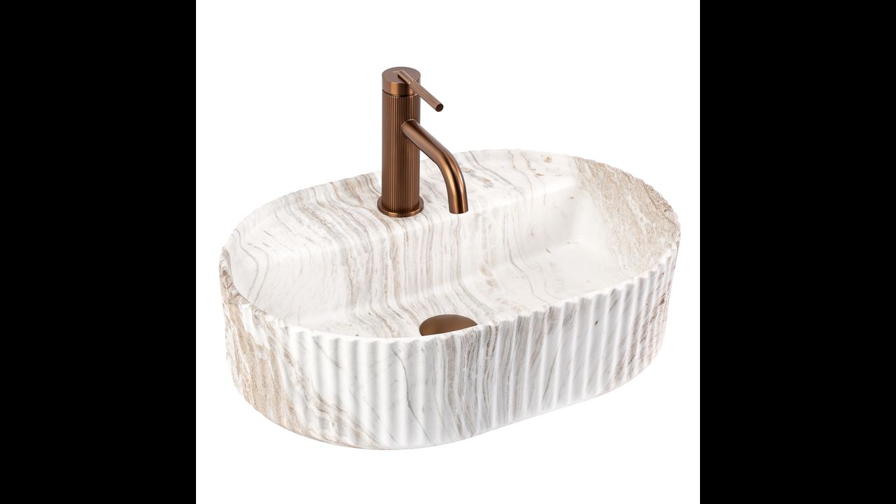 Umyvadlo na desku Rea Marcela 50 ve variantě Kallisto je ideální volbou pro koupelny, kde se počítá promyšlený detail a světlý, elegantní akcent s efektem přírodního kamene – tentokrát ve výraznějším, žilkovaném provedení. Krémově bílý základ doplňují teplé béžovo-karamelové tahy, které se skládají do měkkých vrstev a dodávají prostoru útulnost i prémiový charakter. Tato barevnost skvěle ladí se dřevem, světlými deskami, pískově tónovanými slinutými materiály i s kontrastní armaturou v černé, grafitové nebo měděné barvě.