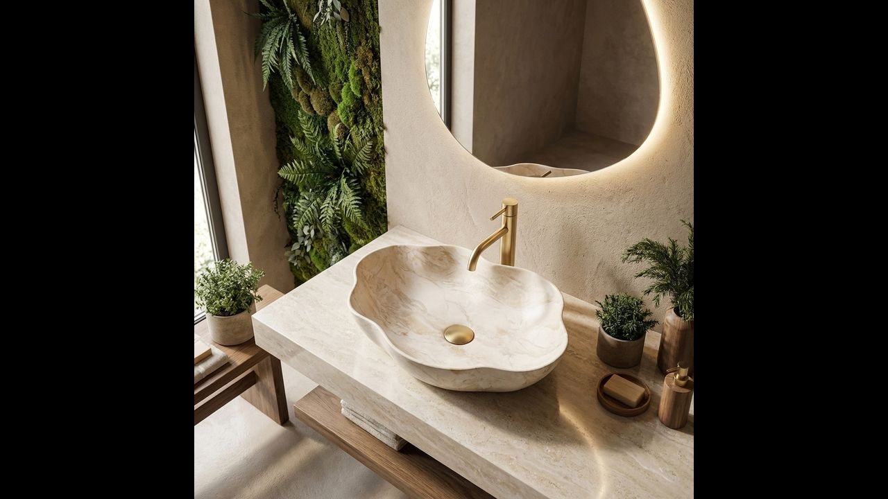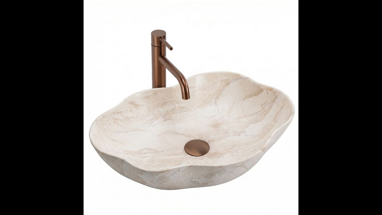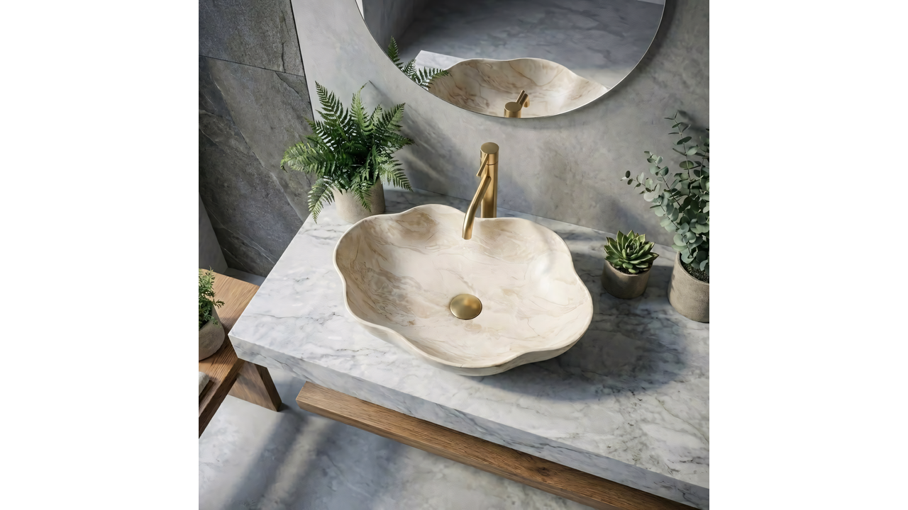 Umyvadlo na desku Rea Pearl Kallisto je model s jedinečným charakterem, který kombinuje funkčnost sanitární keramiky s estetikou přírodního kamene. Vyniká asymetrickým tvarem a elegantním kameninovým dekorem, díky čemuž je výrazným prvkem vybavení koupelny.